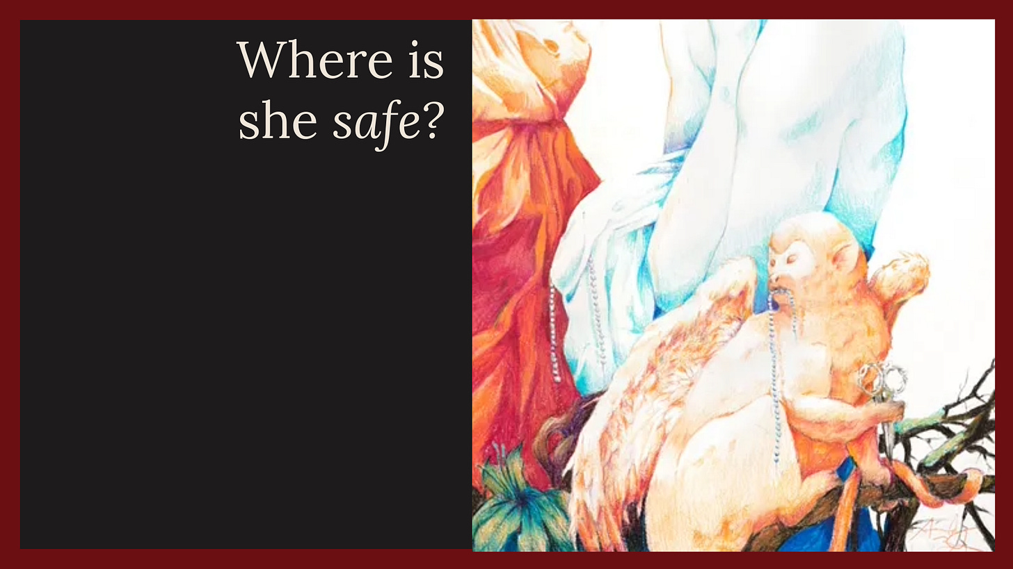 And only now, as everything begins lining up, do I realize I haven’t tracked the part where she leaves me, leaves our home. She’ll also leave the blue bubble of our city and the fragile sense of safety I’ve tried to build around her — a safety I’ve felt eroding every single day of the past year under Trump 2.0, when every news cycle forces recalibration. Every week, the map of where she can safely exist gets redrawn.